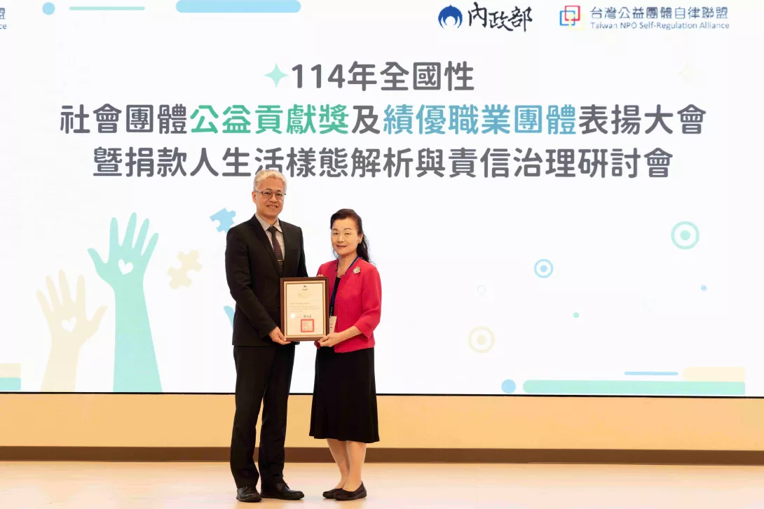 侯美華理事長代表本會接受內政部吳堂安常務次長頒獎( 圖/內政部 公益團體自律聯盟 提供)