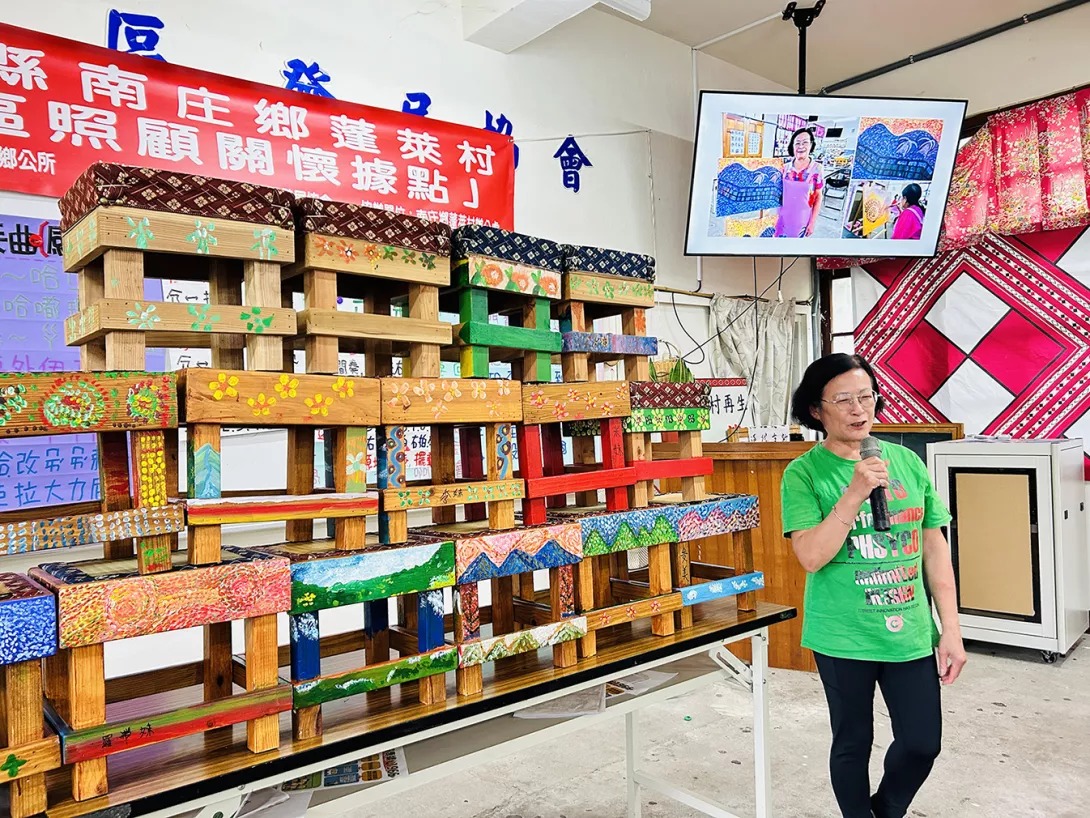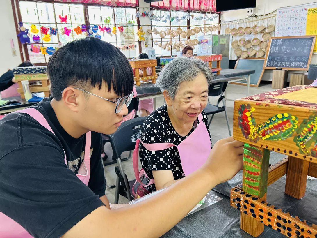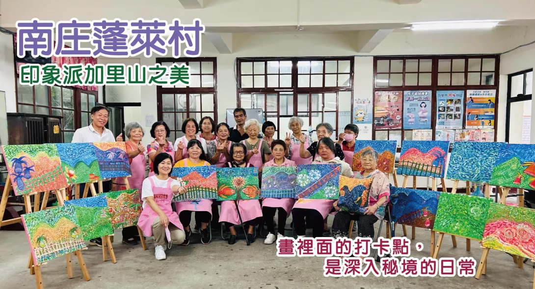 銀粉村環境藝術協會觀察到許多長者面臨手抖、視力模糊等老化問題,特別設計「點點畫創作法」,藉由重複筆觸訓練提高手眼協調與專注力,讓長者能在創作過程中重建自信與穩定情緒。在這裡,他們不再只是被照顧者,而是用畫筆說故事的素人藝術家與記錄者。課程中銀粉村團隊也邀請參與「洄游農村計畫」的東海大學學生進入社區,與長者共同創作,透過藝術串起世代交流與族群文化。學生們說,這樣的課程讓他們重新認識南庄的文化底蘊,也看見長輩用生命描繪土地的力量。