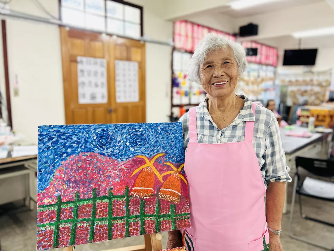 「藝術能成為健康促進的媒介。」這是活動最關鍵的實踐論據。在蓬萊社區的藝術課堂裡,長輩們用畫筆與舞步重新找回生活的熱情。80多歲的范阿婆在喪偶後封閉多年,透過繪畫熟悉的加里山風景重新打開心門。她微笑說:「畫畫的時候,心就比較不孤單。」