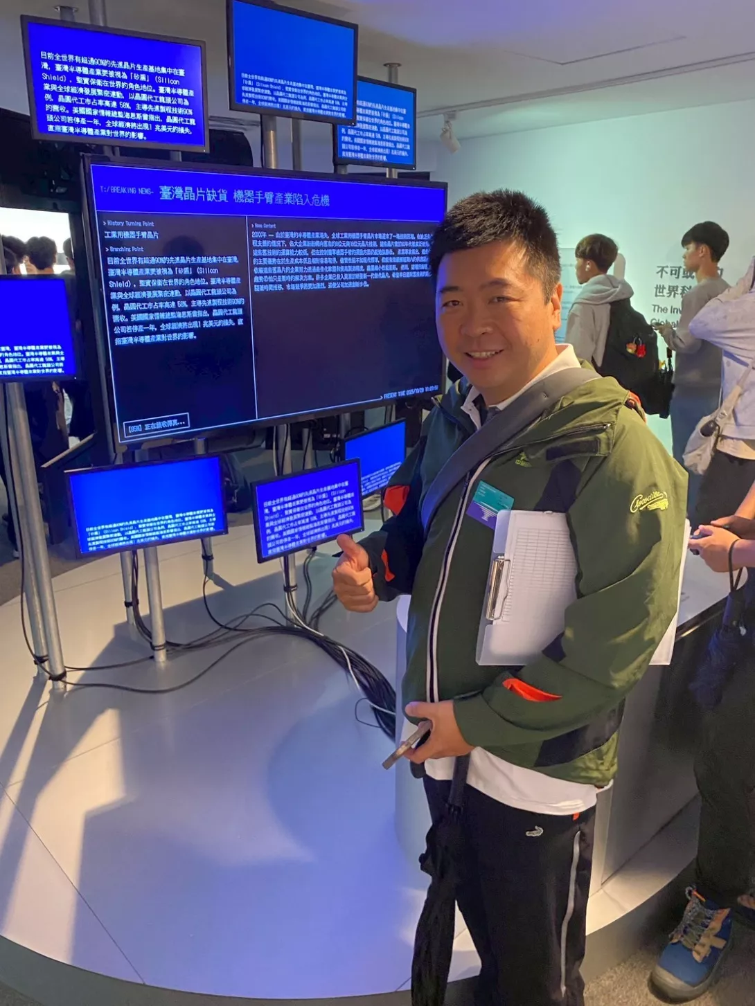 在科技展區,介紹了臺灣第一台自動化機器手臂由大同公司開發的歷史,以及台積電創辦人張忠謀回國推動半導體產業的關鍵過程,並透過AI展示呈現臺灣在全球科技鏈的重要角色。學生們驚訝於「科技即是國防」的現代思維,深刻體認到科技創新正是國家安全與永續發展的重要支柱。