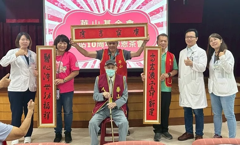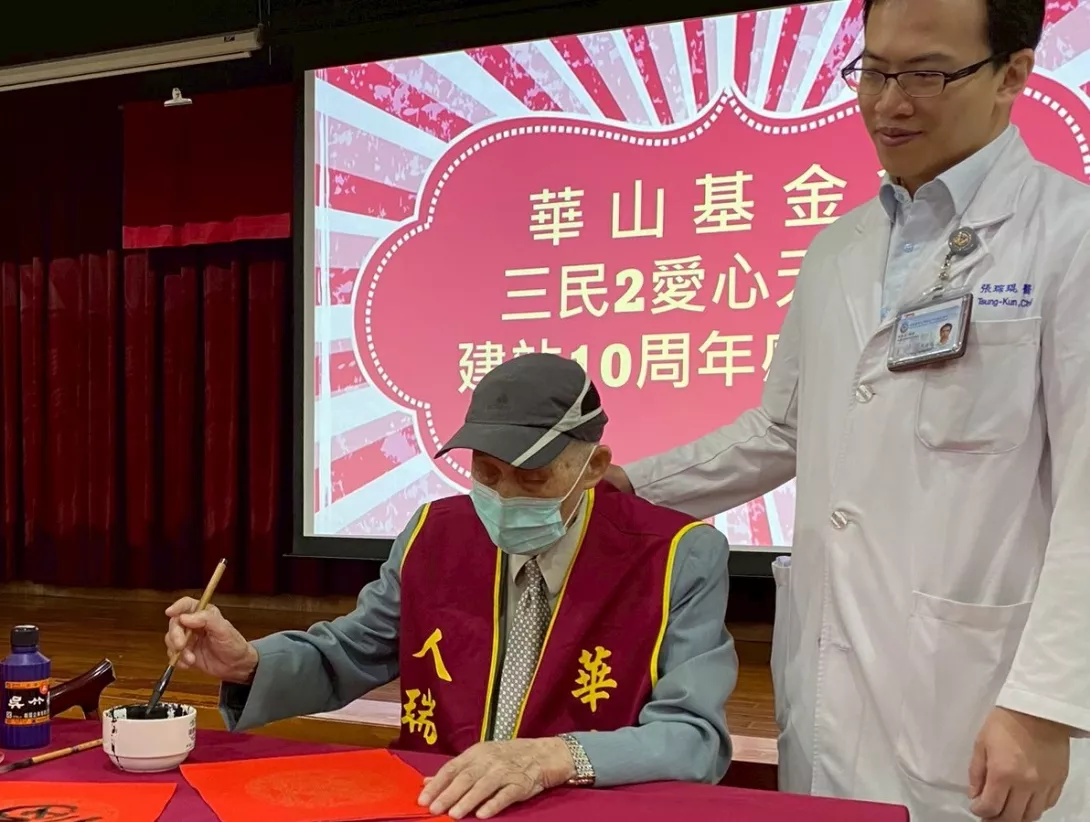 蔡爺爺現場揮毫寫春聯傳遞祝福,高醫願與華山攜手同行,結合在地資源守護在地長輩,持續以行動實踐「扶老共善」的社會責任。不僅展現長輩精神風采,更期許在長者服務的路上,華山與高醫可以持續前行、百年不墜。活動中也分享華山服務影片,並邀請與會來賓及長輩、義工們一起切蛋糕,慶祝三民2天使站10週年生日快樂。