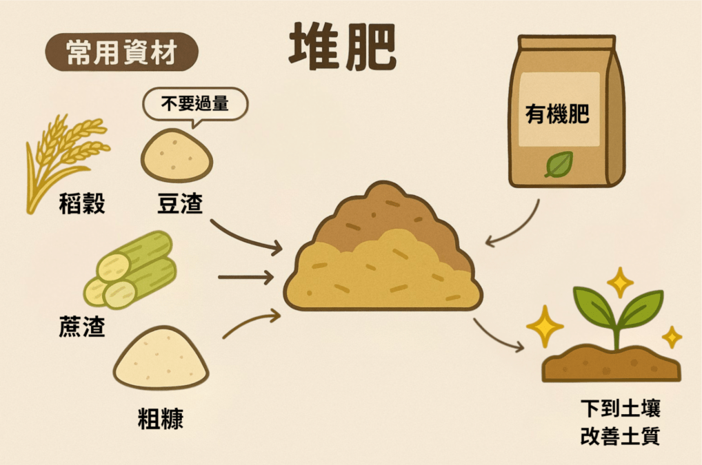 在堆肥的過程中,豆渣屬於高氮肥,若使用過量,雖能讓葉子長得又大又快,但作物的口感會變差,甚至容易腐爛。適量使用的同時,也要補充鈣、碳等元素,讓養分更平均。他會在豆渣中加入米糠、稻殼與有機肥,使堆肥成分更為多元。自製的資材並非不好,而是有時候營養組成較單一。因此,陳幸延會搭配部分外購有機肥,以補足自製資材中缺乏的營養。這些市售有機肥通常含有鉀肥、各種穀粉與微量元素,能讓堆肥整體的養分更完整,促進土壤與植物的健康循環。