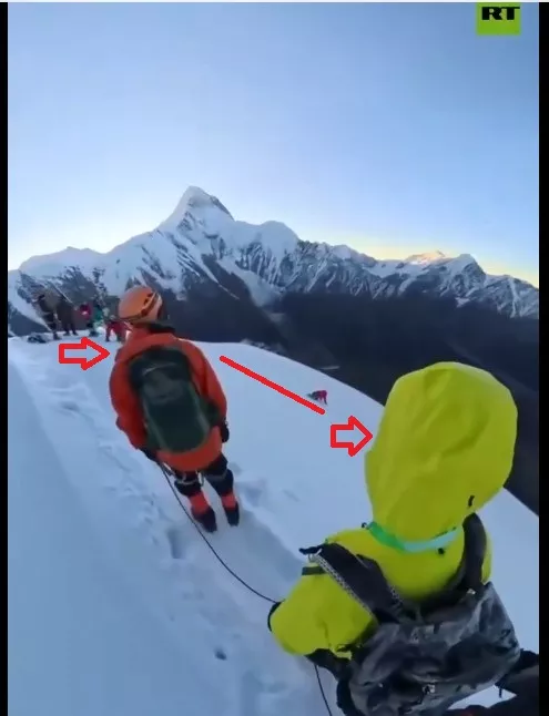 在火中死去是飛蛾最大的幸福?登山,不必有「赴湯蹈火」的心情或壯烈? 山,乃行山者心中的佛,不是妖魔。行者無須燃燒自己,變成山域煙火,更不必在登山中「揮霍」生命,唯有小心謹慎地行山及妥適因應狀況,才有可能修成自我想要的行山正果。本照片截圖自2025.09.28.東森新聞雲(紅色線條及箭頭是百岳老查所加,為該領隊滑墜方向)。是中國一名31歲洪姓男領隊帶隊前往四川,攀登海拔高度5588公尺的那瑪峰,卻在拍照時自行解除安全繩,不幸失足墜落山谷,當場身亡,其他隊員及登山客的目擊影片隨後也在網路上曝光,引發震撼。