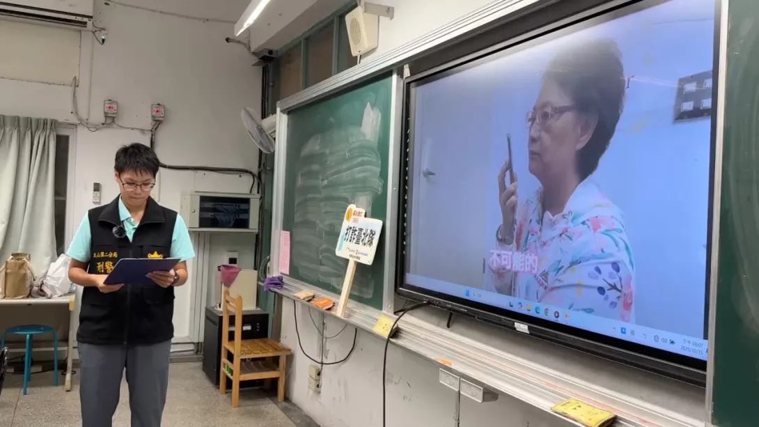 課堂中播放學員自製反詐影片,內容生動又貼近生活,從愛情詐騙、假投資到冒充公務機關等手法皆有呈現。