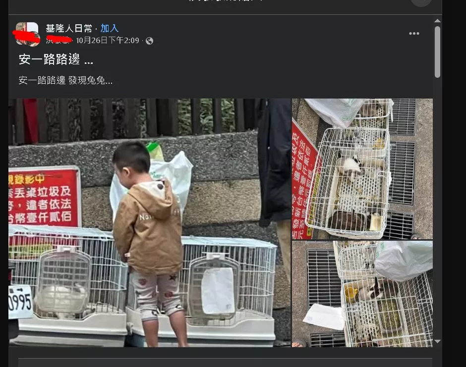 本案是來自地區社團的一則貼文,有一位民眾在基隆的大馬路邊發現兩個大籠子,裡面竟然是兔子被直接棄養在路邊,籠內有兔媽媽、兔爸爸、外加多隻小幼兔共十隻,就直接棄養在大馬路邊的水溝蓋上。有夠扯!