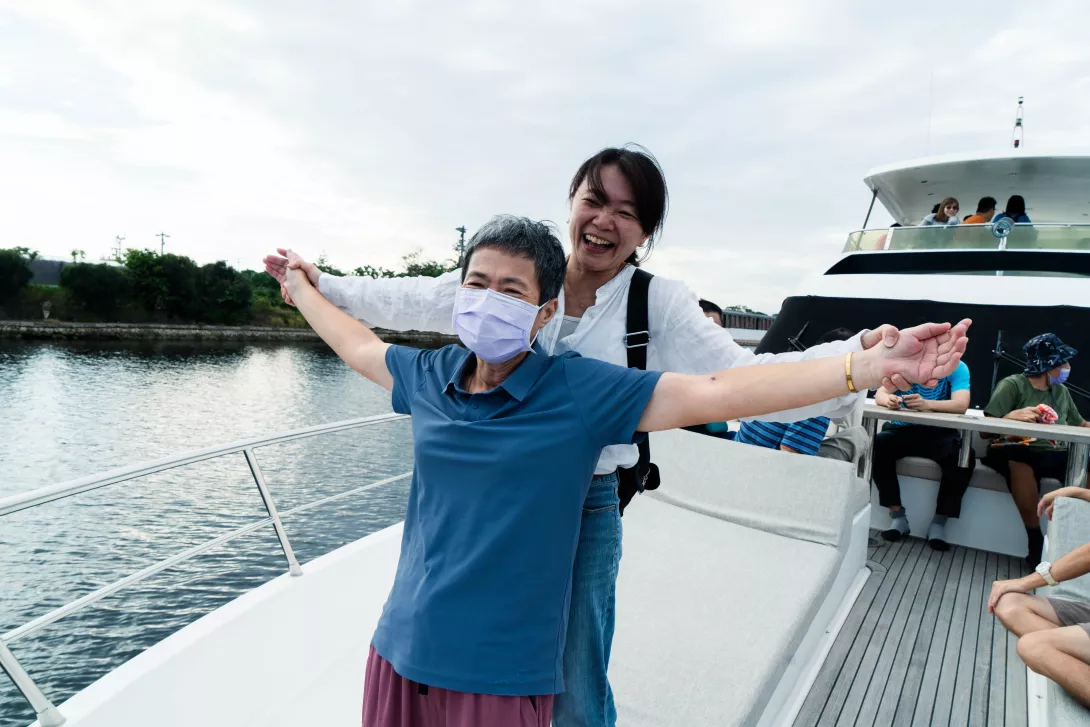 其中有兩位青年起初不敢踏出船艙,在老師的陪伴與鼓勵下,先從船艙窗邊欣賞海景、享用小點,最後也鼓起勇氣走上甲板,迎向海風與更遼闊的視野,展現出自我突破的勇氣。