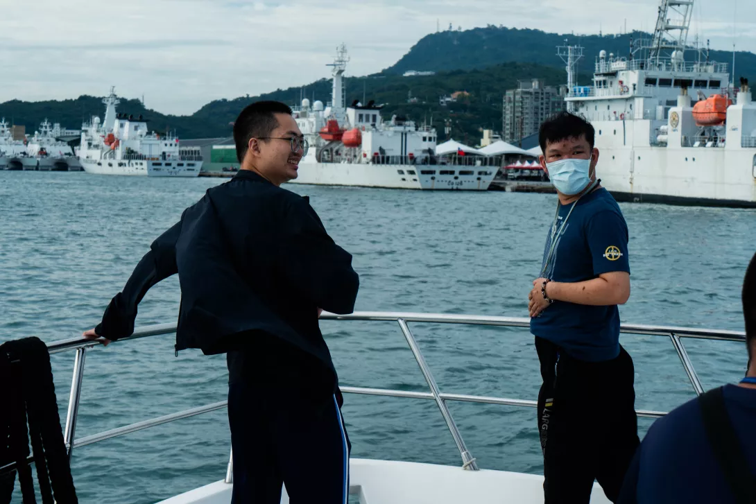 首次的遊艇體驗,青年們都很興奮,一行人搭乘輕軌前往碼頭,雖然幾乎都有搭過高雄渡輪的經驗,但搭上遊艇還是第一次。在碼頭看到「卡利比亞遊艇」,大家忍不住尖叫歡呼,「好漂亮」、「是電視上會出現的那種船欸」,讚嘆聲此起彼落。