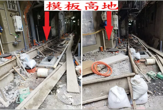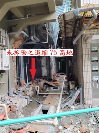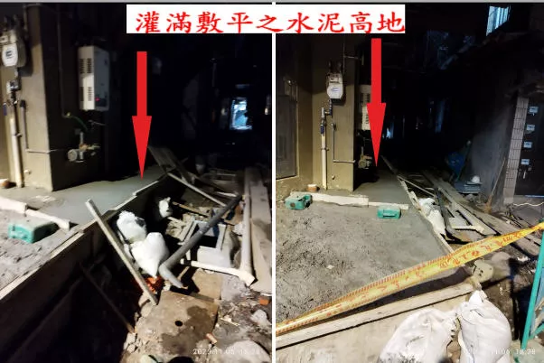污水承包的馨澤公司,幫該二間住戶之抬高地面的平台,不僅敷滿水泥,還抹平,導致與對向退縮的75公分,形成雙側高低差。
