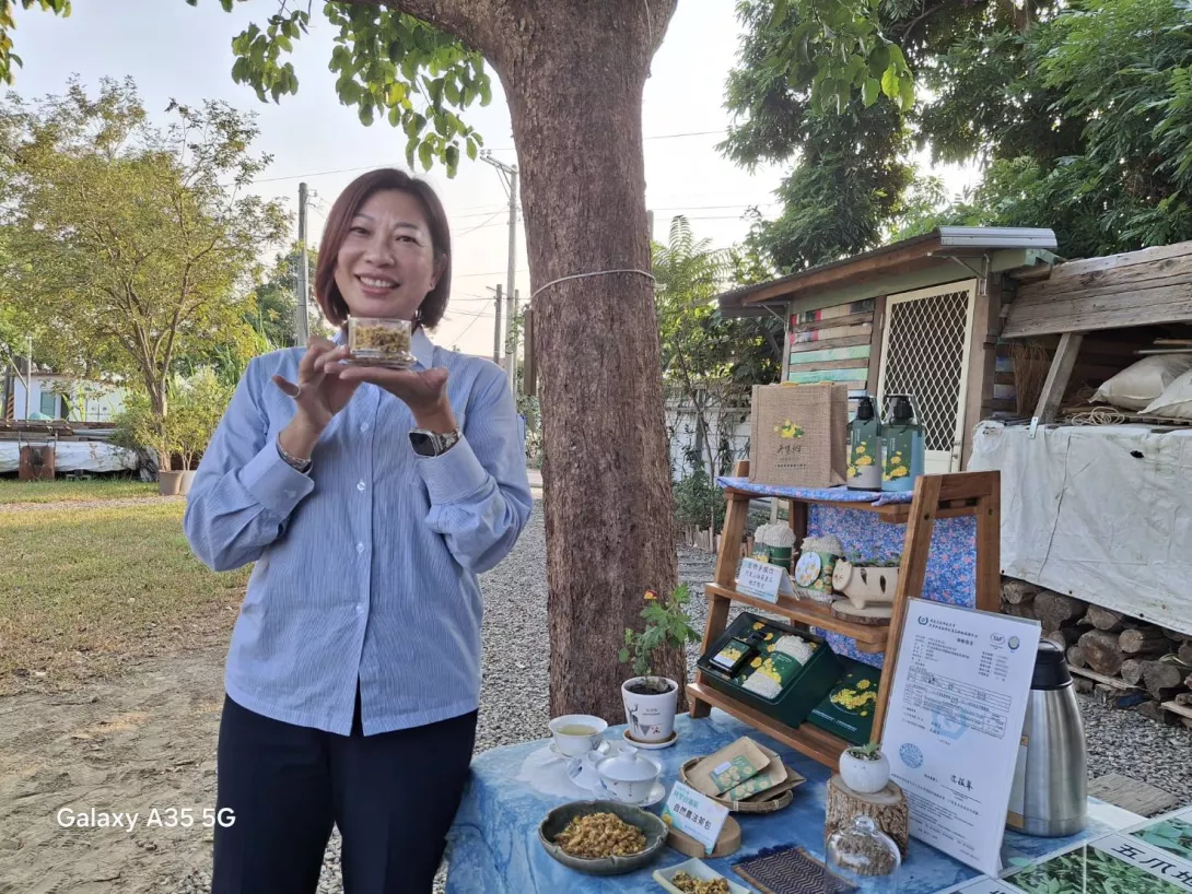 (諄婷組長介紹阿里山油菊系列手作品。記者林慧茹攝)