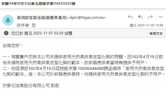 然而,筆者並沒有向欣泰公司,索取過筆者的「家用天然氣供氣定型化契約」,僅向經濟部反映,欣泰沒有提供「家用天然氣供氣定型化契約」給新申裝戶。