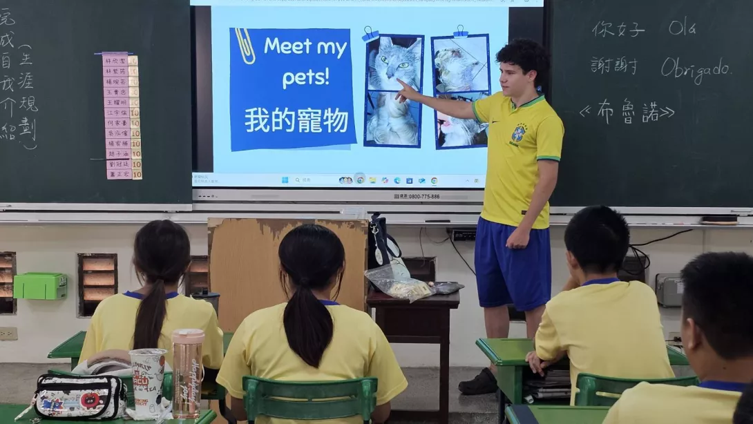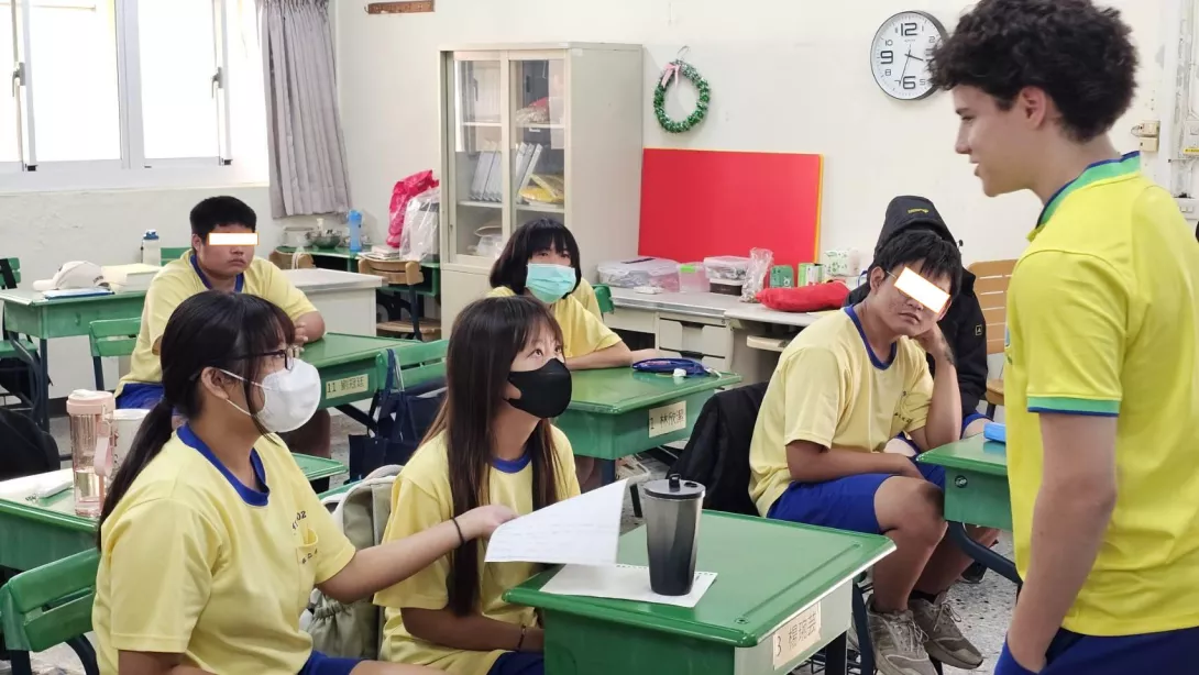 Os estudantes do Curso de Habilidades Funcionais participaram ativamente, fazendo várias perguntas curiosas — como quais comidas taiwanesas ele mais gosta, que tipo de garota chama sua atenção e o que costuma fazer nos fins de semana.