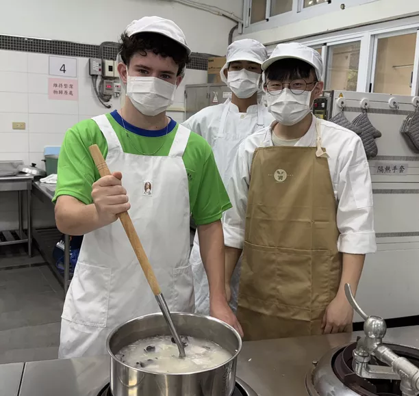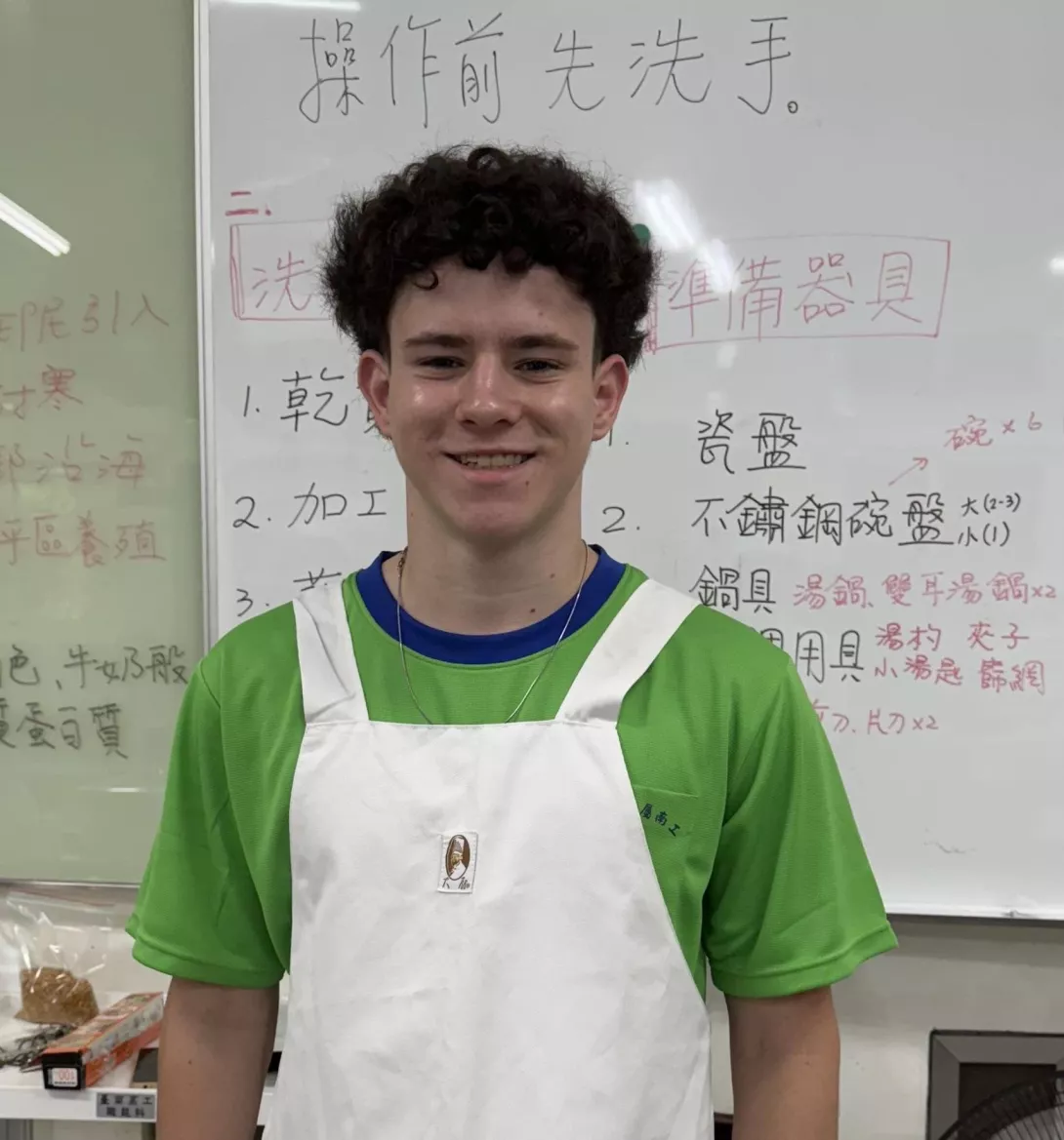 Em 2025, o estudante de intercâmbio brasileiro Bruno, participante do Programa de Intercâmbio de Jovens do Rotary International (RYE), não apenas estuda disciplinas acadêmicas na Escola Técnica da Universidade Nacional Cheng Kung, mas também participa das aulas de Culinária do Curso de Habilidades Funcionais Integradas, onde aprende a preparar pratos junto com os estudantes locais, praticando o idioma, conhecendo a cultura e fortalecendo laços de amizade.