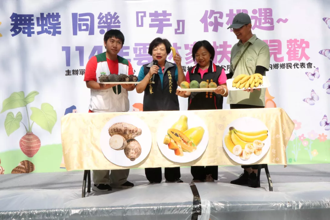圖說:林內鄉代會主席許林玉琴(左二)介紹在地芋頭、木瓜..等特產,支持並肯定雲林家扶於林內紙蝶生態地景園區辦理相見歡活動。