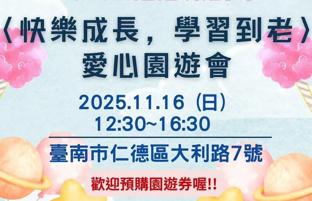主辦單位再次呼籲社會各界人士,共同鎖定 2025年11月16日(日),前往台南市仁德區大利路7號。讓我們一起用行動支持教育、用愛心擁抱偏鄉,共同成就一場最溫暖、最有意義的「快樂成長,學習到老」愛心園遊會。