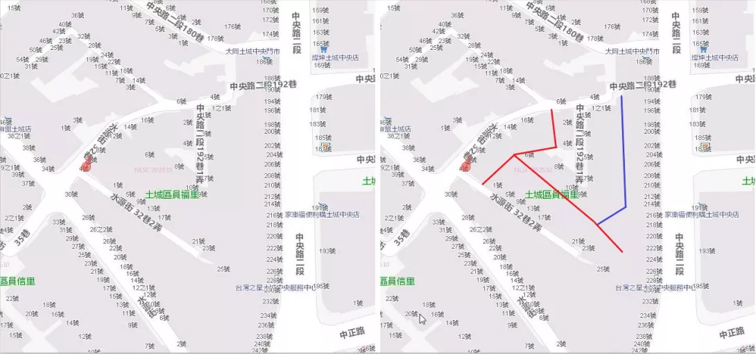 污水完工區域為土城區中央路2段194-220號,暨土城區中央路2段192巷1弄單號之共同巷(24.97602, 121.44173),藍線區域屬第二階段施工範圍