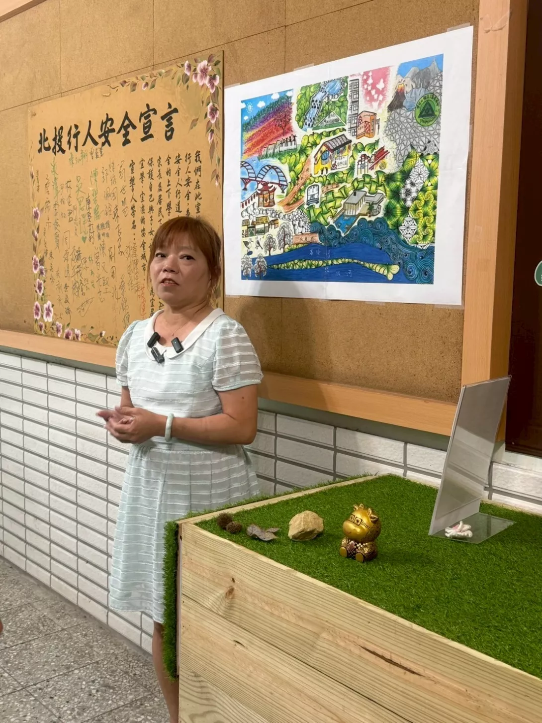 當然北投最有名的是北投石,我手上拿的這個其哩岸石,當然我不會拿它來作畫,但是我用另一種石頭去找另外的媒材,我把北投石跟其哩岸石的歴史講給同學。地上隨手撿這是楓香葉子,我們北投的中山路就我們上來這個中山路,還有新民路有很多種的這個楓香。掉在地上的葉子即使殘破不堪、有洞,甚至就是不完美,他們會是我們的上課的媒材之一。我們很喜歡用,隨手可以拿到的東西來創作。還有就是這個楓香的種子,我比較常用畫好的圖,我這邊割了兩條線,把這個東西插上去,它跟我的圖完美。