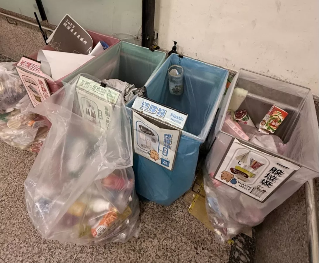 ▲垃圾分類回收區雖整齊,但仍可見錯誤丟置的垃圾。攝|林柏森