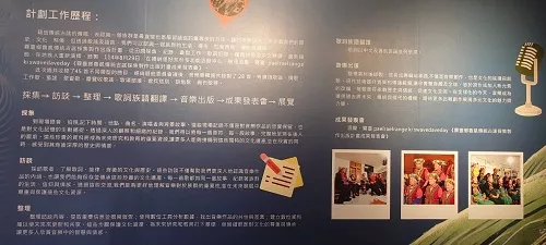 《洄聲.霧臺》特展並非僅以聲音呈現,它透過精緻的視覺設計,讓古謠的文本性與影像性得以彰顯。展場牆面上,一張張經年累月的珍貴照片被細心陳列,它們記錄了歌謠在生活中的場景、承載者與傳唱者,是歷史的見證。每一張影像的旁邊,都附有古謠的歌詞原文與精確翻譯,將原本抽象的聲音,轉化為可閱讀、可理解的文字故事。