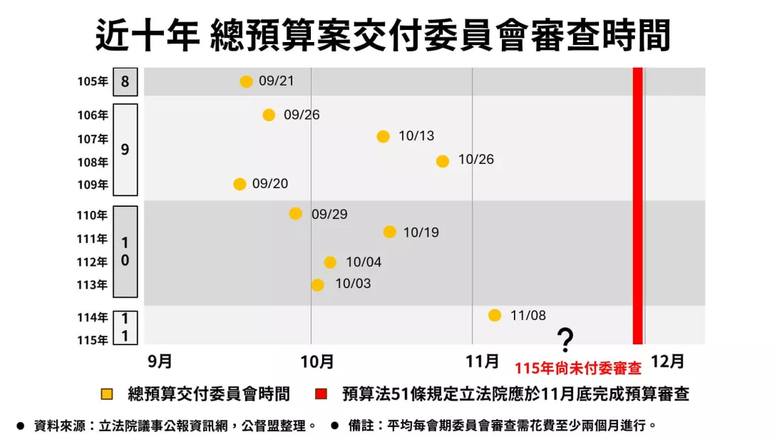對比過去幾屆,立法院大多在每年九月底即邀請行政院長、主計長、財政部長等部會首長列席報告總預算案,並交付委員會審查,讓委員會有至少兩個月時間逐部會審查上千頁預算書,並與行政部門充分溝通;然而,今年情況卻大幅偏離常軌,甚至比去年六度退回總預算案的爭議更晚啟動審查。