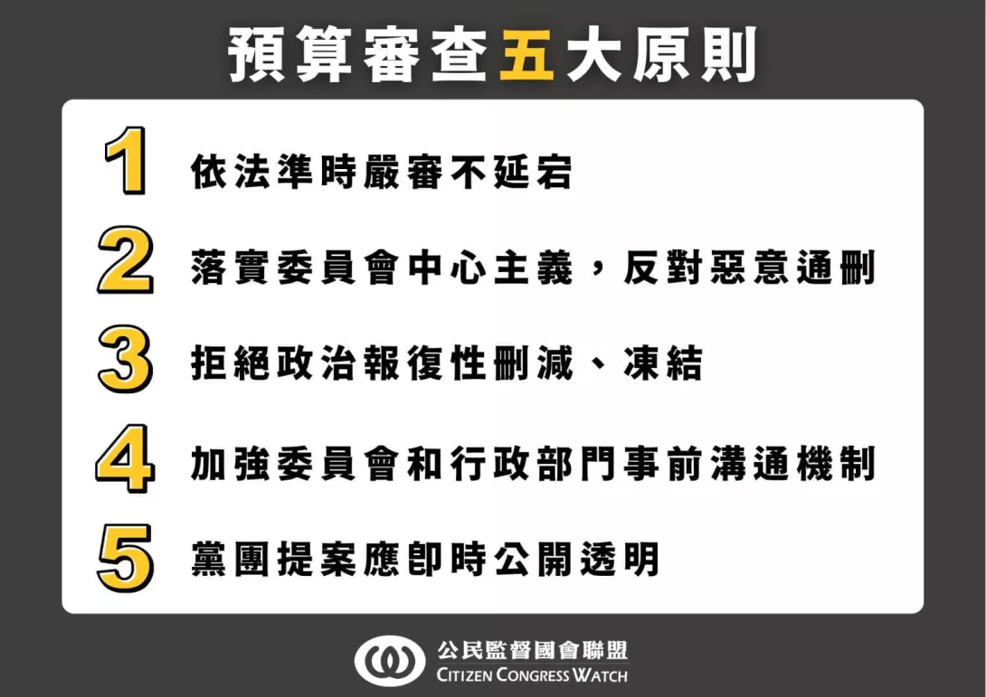 第二、落實委員會中心主義,反對惡意通刪:公督盟強調,預算審查應回歸委員會專業審議機制,依部會職掌逐項檢視,不應恣意用通刪方式「一刀切」凌駕委員會的專業討論。