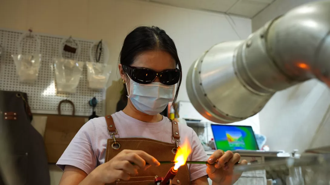 「我認為燒玻璃是一個很神奇的東西。」她感性地說。「在燒製的時候,它會隨著溫度變得柔軟,你可以拉出自己想要的形狀。最重要的是,整個過程中注意力會很集中,內心會變得平靜,最終做出屬於自己獨一無二的作品。」