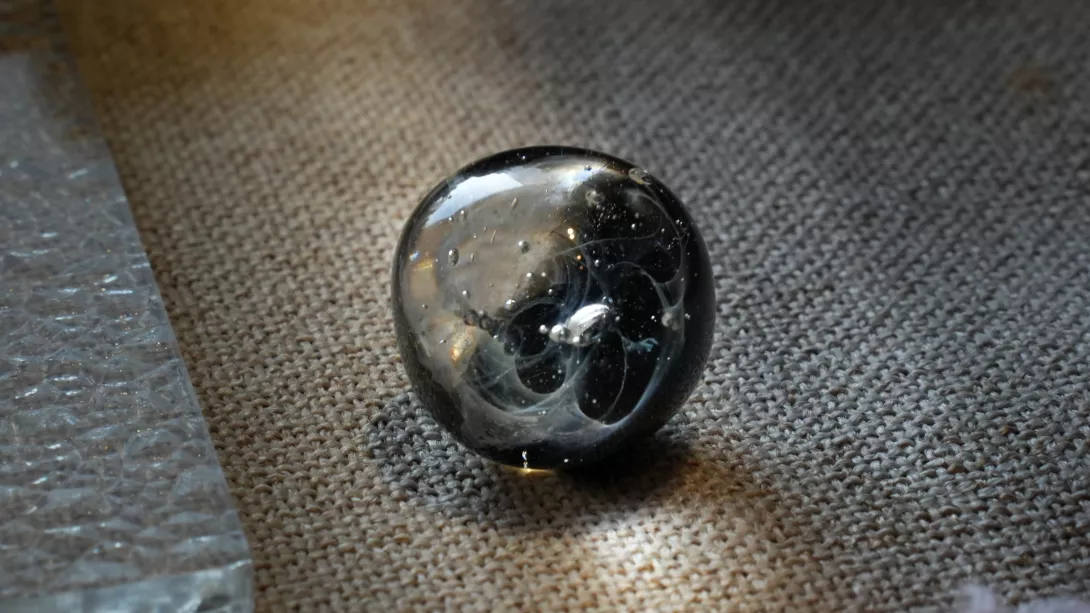 由於毛髮主要由蛋白質組成,經過高溫燒製後會在玻璃中消失,轉化成微小的氣泡。這些氣泡被巧妙地保留下來,在玻璃球中呈現出宛如星球星軌般的紋理,因此毛髮玻璃通常會被製作成「星空球」。