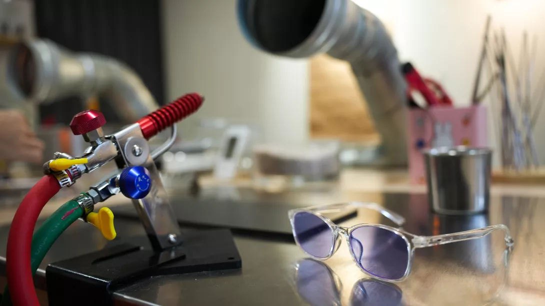 燈工火焰可達一千三百度,學員須綁髮並避開火源;同時店內提供專用防鈉光眼鏡,能過濾多重有害光線。【記者 徐筱瑜/攝影】