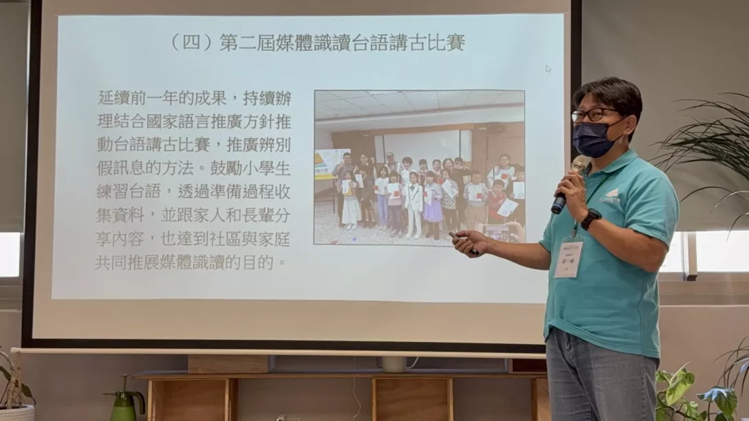 南湖社大主任邱一峰:他的一些相關的識讀是有規劃,包含的就是媒體素養,融入教學的講師四門課喔,草根查核至少五則,呼應我們全促會的要求要有五則喔,分別是王陳雪霞老師的新住民跟外籍人士,因為他們來台灣要適應生活,要告訴他們怎麼去使用,這個我覺得蠻實用喔。那第二門薛玉麗老師,他本身是在教閩南語,現在正名叫台語,他就是台語來教,大家想怎麼用台語,然後黃紹普老師,他本身是台中市政府新聞局的,所以他教太極拳就會用這方面來融入喔,在現場有食農教育裡李安豐老師,他用媒體識讀來解讀,這一個公民記者班,我們第一期班有28個學員,那目前上傳超過30則的報導,有一個主題我在想大家都有點卻步,是百公職人誌公民記者新聞報導,我們針對南屯的一些傳統行業去做主題式,那原本預計無法招生,那後來改成免費收保證金,就超過20個人喔,目前也已經有30則傳到PeoPO新聞,所以兩期現在大概60則,第三個是那個滑手機也能健康,因為這個老師,也是瑜伽老師,碩士論文寫那個運動傳播,所以我就請他講這個,然後有一天看商業周刊提到的人心詐騙太震撼了,所以我就自己親自上公民素養,去年的成果還不錯,那就是說第一個媒體識讀,那怎麼樣用台語,來教小朋友除了講母語之外,然後更重要的就是親子一起講,我們第一個階段更重要的就是親子一起講,我們第一個階段就是要先有一個工作坊,參加的人教他怎麼講,就是比賽的過程媒體素養增能工作坊喔