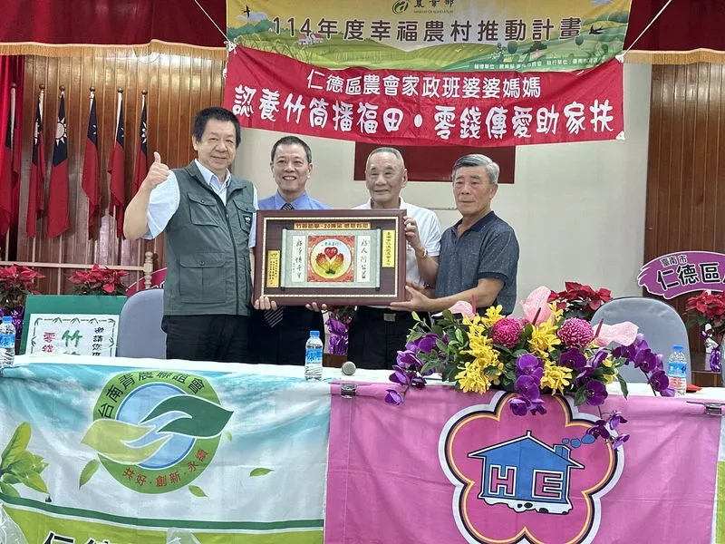 仁德農會歷年來獲獎無數,除曾於108年獲農委會第一屆全國十大綠色照顧優良典範外,也被列為全省前十名的優質農會,今年家政班也獲得114年台南市「特色家政班-家政班之最」活動中,獲得「人之美」冠軍殊榮,以及全國四健作業組教案設計競賽中獲得季軍,展現農會深耕地方、關懷社會的多元成果,曾帶領團隊榮獲農金獎的農會總幹事曾佳哲表示,與家扶結緣於民國95年,一則家扶兒考取優質大學無能力上學的新聞讓家政班成員開始認養「竹筒愛心撲滿」,他說「助貧不應僅僅是一個人做而是要集合同事們一起做,才能發揮聚沙成塔的更大效益」,歷經20年始終不曾間斷且愈來愈多員工及青農一起加入扶幼行列,充分發揮銅板傳愛的精神,並帶動現場氣氛,總幹事曾佳哲每年都拋磚引玉先捐贈一萬元,理事長陳木發、常務監事蔡壬癸、秘書許天厚及秘書梁秀玲也隨之響應,一起帶領員工及家政班成員繼續認養竹筒,期透過集小愛成大愛的行動持續支持家扶扶幼業務。