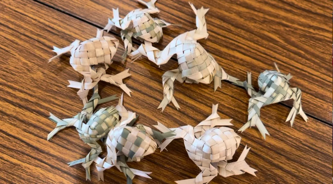 一隻隻竹編青蛙於民眾指尖逐漸成形。