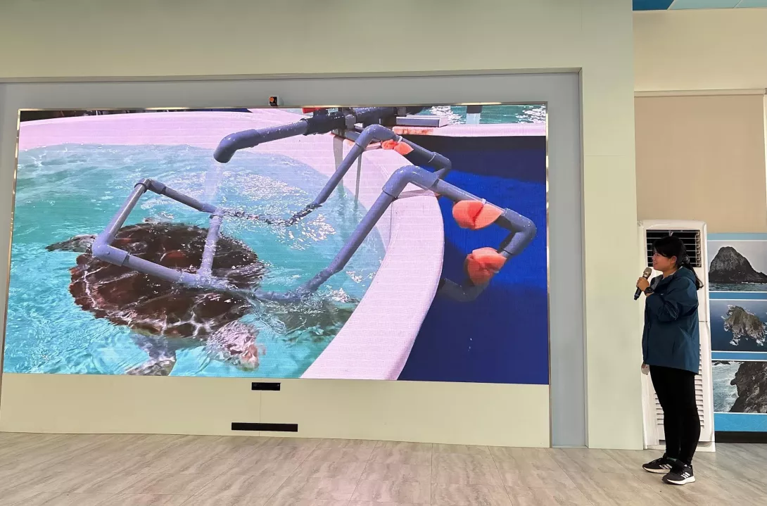 ▲陳毓蓉解釋擱淺海龜救援復健現場。攝|陳乙伶