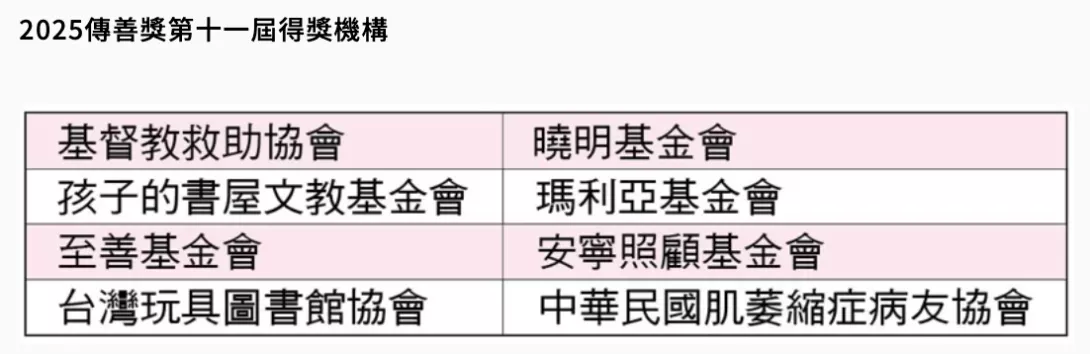 本屆八家獲獎機構包括基督教救助協會、孩子的書屋文教基金會、至善基金會、台灣玩具圖書館、曉明基金會、瑪利亞基金會、安寧照顧基金會與中華民國肌萎縮症病友協會,涵蓋兒少照顧、偏鄉教育、障礙支持、安寧照護、病友服務、惜食循環及組織數位轉型等領域,每家將獲得每年500萬元、連續三年共1.2億元的支持,期待協助機構在穩定資源下持續創新與成長,為台灣織起更堅韌的社會安全網。