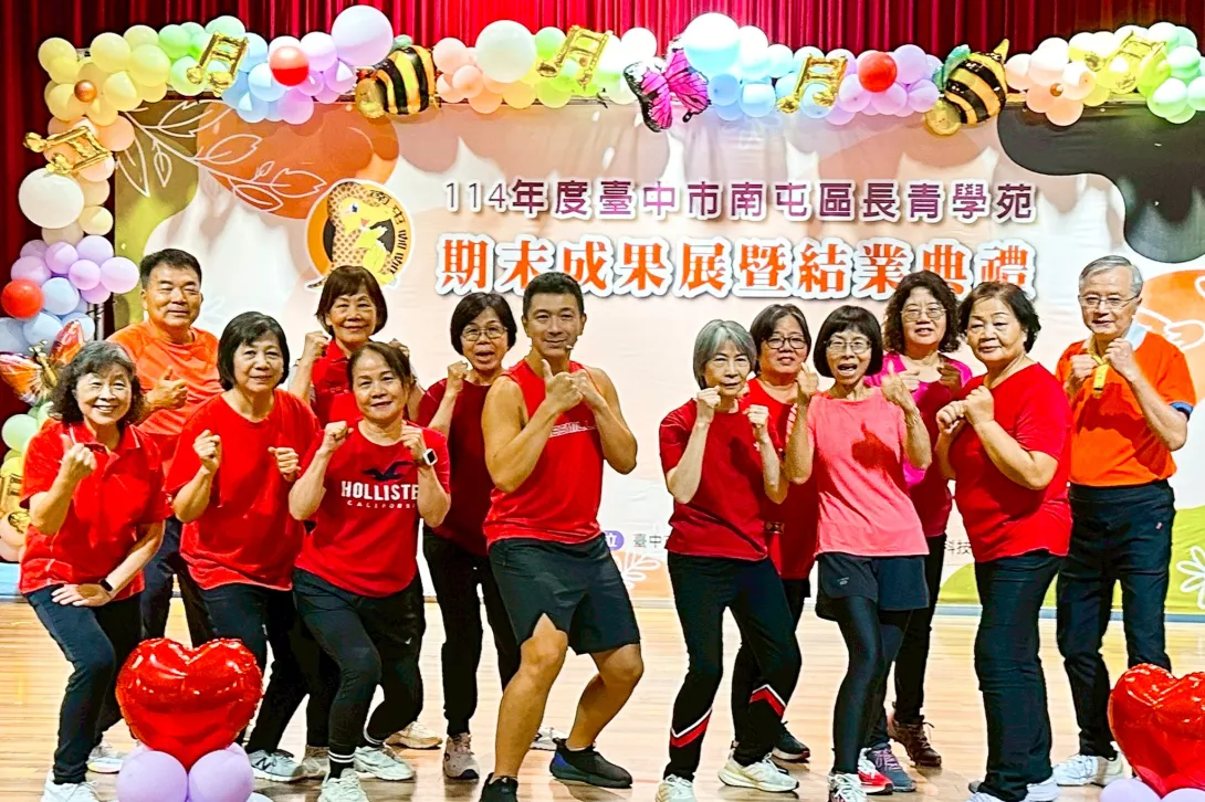 臺中市南屯區長青學苑114 年度期末成果展暨結業典禮於豐樂雕塑公園盛大登場,以「跨越世代,智慧綻放」為主題,吸引逾600位學員熱情參與。活動由「健康樂活趣動動班」揭開序幕,平均年齡超過72歲的長青學員,以熱力四射的舞蹈,贏得全場熱烈掌聲。社會局主任秘書侯淑茹及南屯區區長林秋萬也特別到場向長青師生表達誠摯的祝福,並肯定南屯長青學苑班級幹部熱心服務,成為串連學習社群的重要力量。