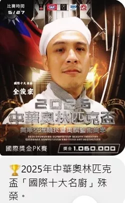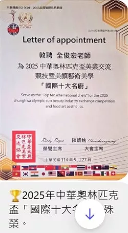 2025年: 獲聘擔任中華奧林匹克盃「國際大名廚」暨國際廚藝評審,標誌其廚藝專業獲得國際級賽事標準的認可。