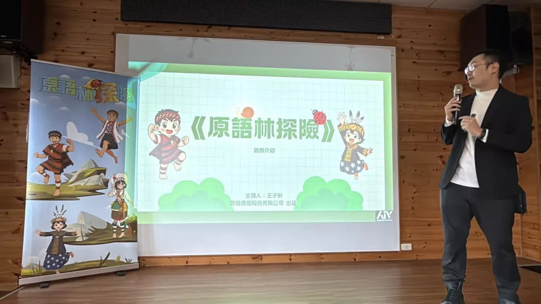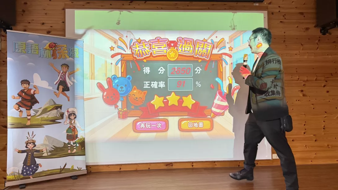 在贈書儀式後,學生們體驗 VR 沉浸式科技學習,透過虛擬實境設備探索科技所帶來的無限可能。其後的「原語林探險」族語教育平台展示更讓現場氣氛達到高潮。平台以故事情境、角色互動與遊戲關卡方式呈現族語內容,不僅活潑生動,更使孩子在遊戲中自然產生語言敏感度。多組師生展現高度默契,在闖關活動中合作取得超過 2650 分與 91% 高正確率,充分展現科技對族語學習所帶來的投入與效果。