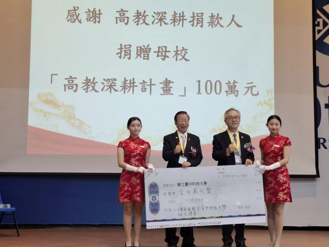 校長陳同校肯定校友會每屆的傳承,對於校友會積極規劃會務並展現的強大向心力,中科大校長陳同校指出,學校在校友光環照耀下,五專註冊率維持近百分之百。因專注教學獲教育部支持,高教深耕經費每年增 2,000 萬元,總經費將近破億。鄭會長並捐贈 100 萬支持急難救助及弱勢助學。校長呼籲校友持續大力支持,共同讓學校奮力向前,共創屬於臺中科大的下一個榮耀。