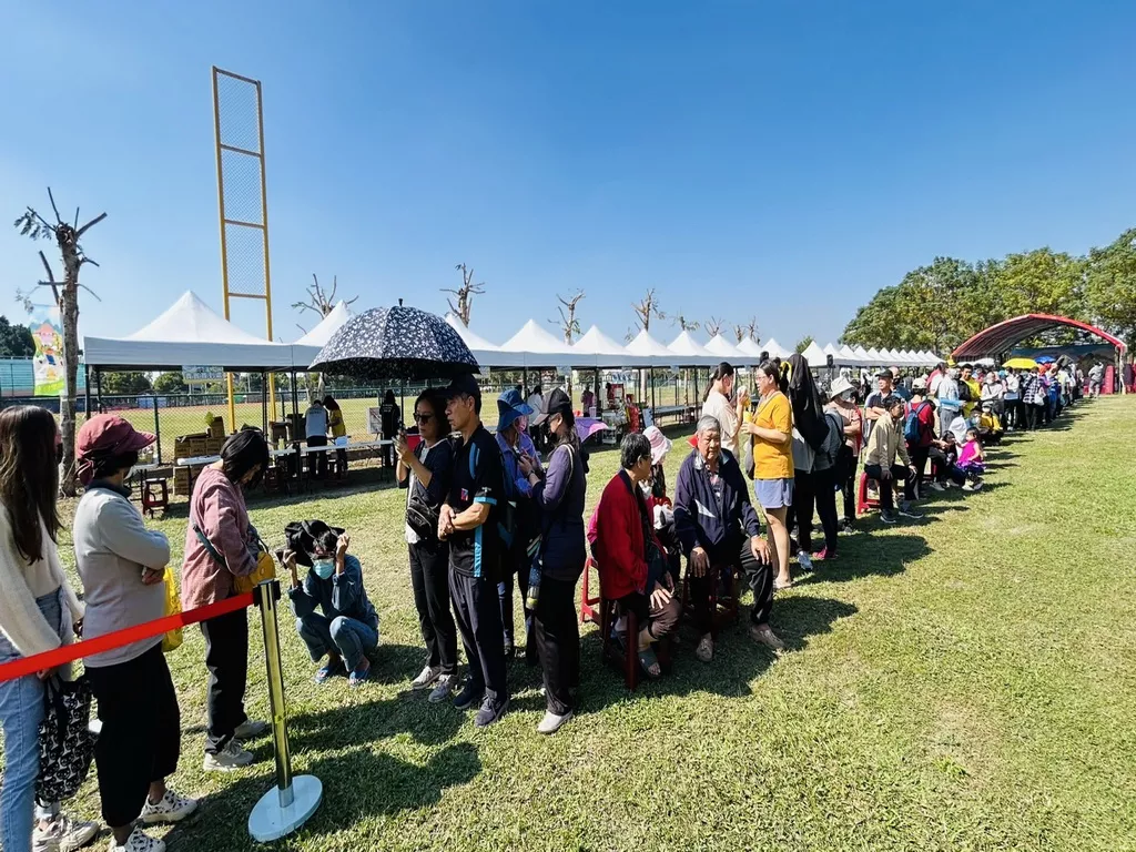 ▲114年永靖鄉米食果苗節活動開始前,就有大批鄉親排隊等候發贈果苗極品嘗美食。(圖/記者周厚賢攝)