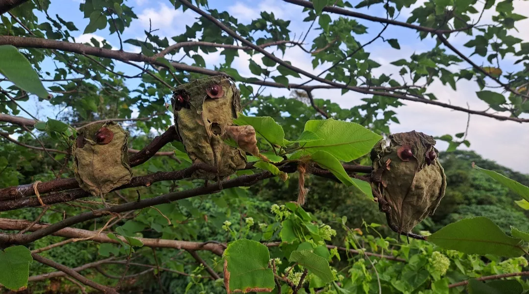因為這五分港溪有河岸的風光,那有水稻的這個環境所以有蜻蜓的生態就很豐富,那而且五分港溪又臨近關渡平原,所以這裏的鳥況生態其實非常的棒。所以我們這裏呈現就是有鳥,然後有蜻蜓的生態那還有呢,我們的五分港溪可以常常觀察得到斑龜的生態,所以就這個斑龜你看它的背就是利用廣東油桐的果實,有沒有廣東油桐的果實,那這個是小葉南洋杉的葉子然後變成它的頭跟腳,所以都是利用就是利用植物的果實跟葉子構築成各種不同的這裏五分港溪的生物多樣性。那除了説可以做一些創作以外我覺得更重要的是希望透過這些五分港溪這裏出現的一些生物的造型,能夠引發大家能夠更關注五分港溪這些的動物的生態。