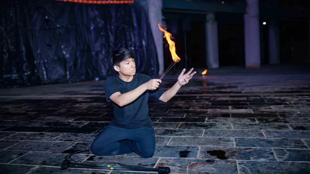 中正火藝社第12屆社長陳霆峻在火舞表演中擅長情緒堆疊,尤其編舞注重節奏變化跟卡點。【圖片來源 蔡宇洹/提供】