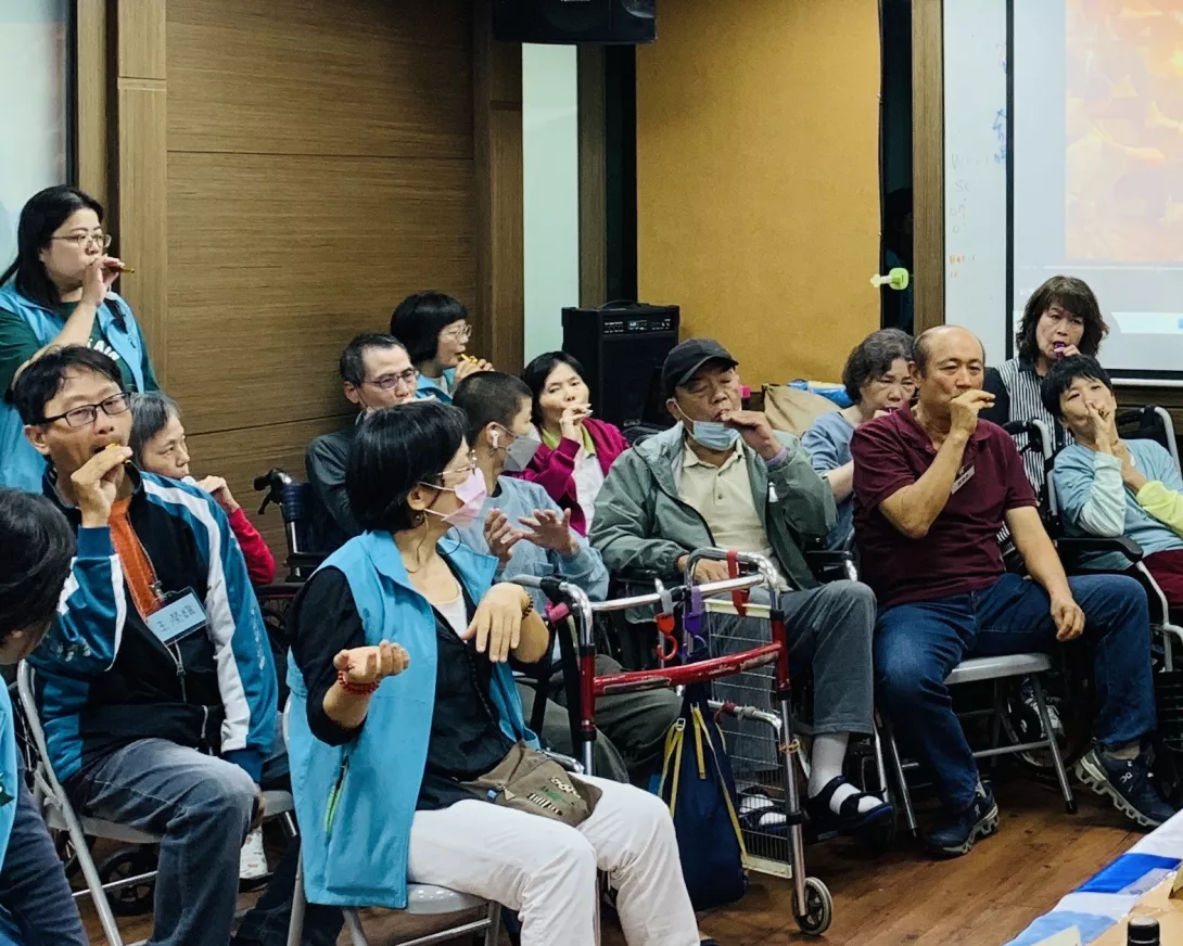 ▲小腦萎縮症病友協會南區病友「卡祖笛」樂器復健團世界首演