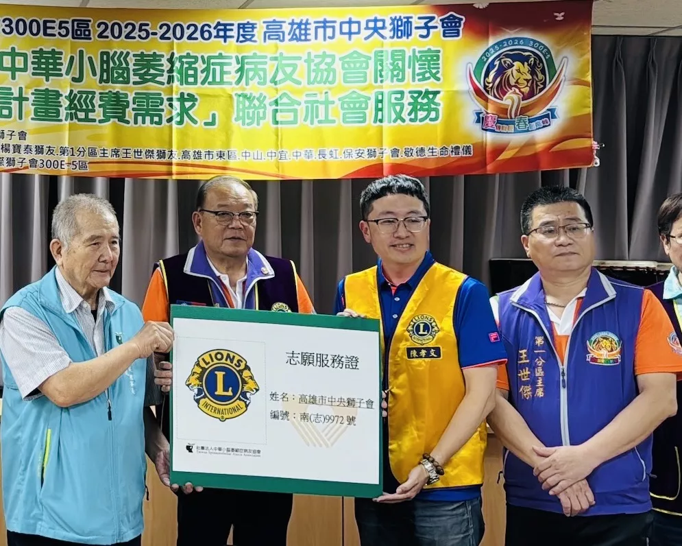 由於近年大環境經濟不景氣,民眾雖仍有捐款意願,但捐款金額相較往年普遍縮減,小腦萎縮症病友協會接獲病友家庭物資需求的案例也增多,此次高雄中央獅子會除透過「每日愛的一餐」持續提供10位病友半年流質營養品經費支持,也允諾日後獅友們會長期以志工身分,投入時間和行動給予協會、病友關照及協助,希望讓病友更有意志面對未來漫長病程的種種難關,協會也特別製作大型志工證頒發給高雄中央獅子會陳孝文會長和獅友代表們。