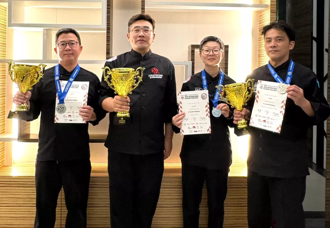 而在名師帶領下,學生選手也展現出色實力,整體團隊最終獲得1金、6銀、3銅與佳作1項,成績斐然,充分展現「名師出高徒」的教育成果。二年級黃悅華以沉穩台風與細膩烹調技法,勇奪「靜態冷展—亞洲異國風味主菜」銀牌,並於「亞洲風味創意炒飯」獲佳作肯定;四年級許舒涵在「烘焙伴手禮組」以精準操作奪下銀牌;一年級喬家珍於「創意麵食料理」中憑創新概念摘下銀牌;四年級陳玉珍則在「亞洲異國風味主菜」勇奪銅牌;二年級陳芊菱在「創意麵食料理」中以穩健表現獲得銅牌;二年級蔡欣恩在「亞洲風味創意炒飯」中以香氣層次與口味平衡獲得銅牌肯定。青年選手面對國際評審的高度標準,仍展現出專注、穩定與創造力,再度讓臺灣餐飲教育能量躍上國際舞台。