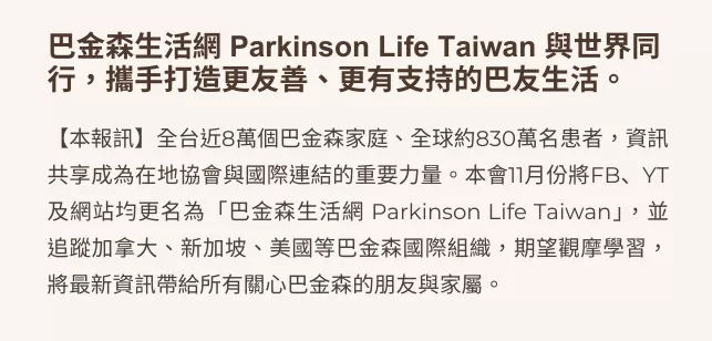 巴金森生活網 Parkinson Life Taiwan 與世界同行