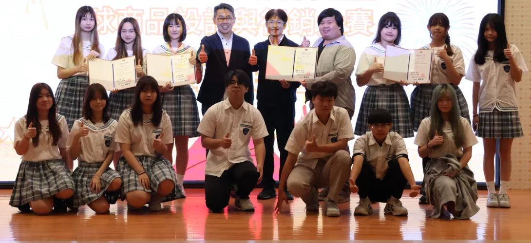 本屆高中職組大贏家鶯歌工商得獎學生手持獎狀,與指導老師及主辦單位代表合影,展現青年創意能量。(圖/商應系提供)