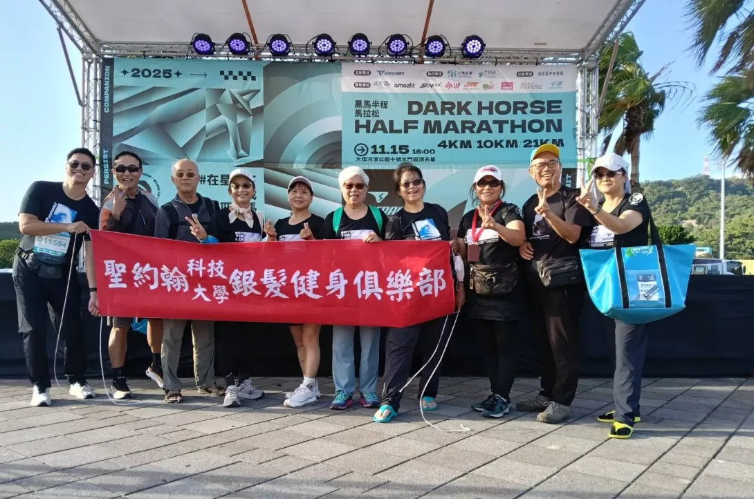 聖約翰科技大學銀髮健身俱樂部組隊參加「2025 黑馬半程馬拉松」,共動員13位銀髮學員與教練參與,其中 4 人挑戰 10 公里組,9 人參加 4 公里組,成員加起來年齡突破千歲,堪稱實至名歸的「千歲跑團」。在兩位教練盧詩淇與吳家祥的帶領下,大家以穩健步伐與成熟跑者風範,平安順利完賽,展現樂齡族群依然可以自信奔跑的活力姿態。