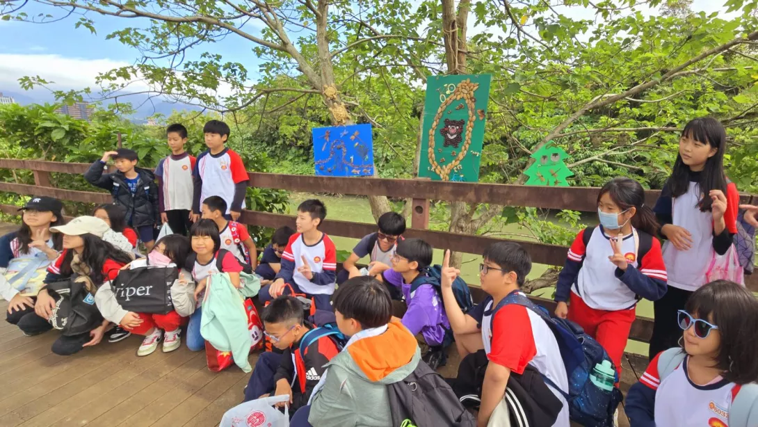 自然步道協會 步道生態講師葉淑蓮說: 這一站主要是我們自然步道協會的很會手作的老師,運用我們大自然的素材來做一些創作,包括植物的果實或葉子,或者是枝條來做各種不同的創作,那像這一幅呢,這一幅就是利用我們五分港溪現有的常見的水黃皮的果實,構成一個大的那個臺灣的形狀,所以這個叫臺灣熊讚 裏面剛好有一隻熊,這個熊呢就是利用也是五分港溪常見的肥豬豆裏面的種子,構成它整個熊的那個型態。希望透過這些五分港溪這裏出現的一些生物的造型呢,能夠引發大家能夠更關注五分港溪這些的動物的生態,希望大家能夠好好愛護這裏的生態環境。