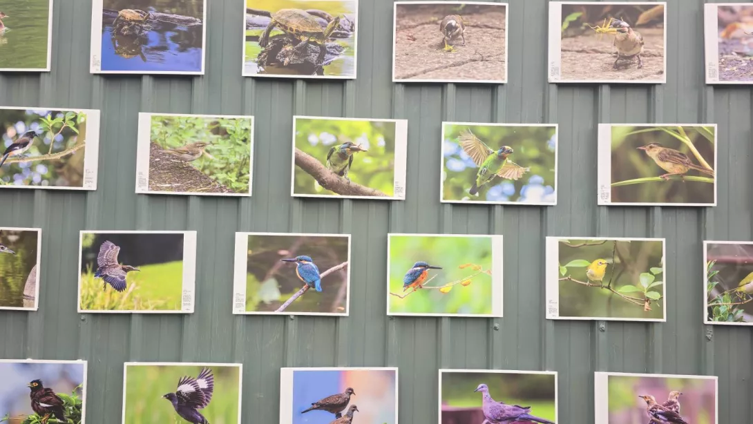 生態攝影師黃瑛琪說: 五分港溪這周圍的那個環境,是那個鳥類其實蠻多的,那剛好有這個藝術祭的這個展覽,那我其實也很榮幸有機會共襄盛舉,所以我就來尋找這地方的鳥類,我來這個地方總共有8次,每次來的鳥都遇到很不同的鳥,那我其實蠻高興的,不管水裏游的天上飛的,或是過境的候鳥。