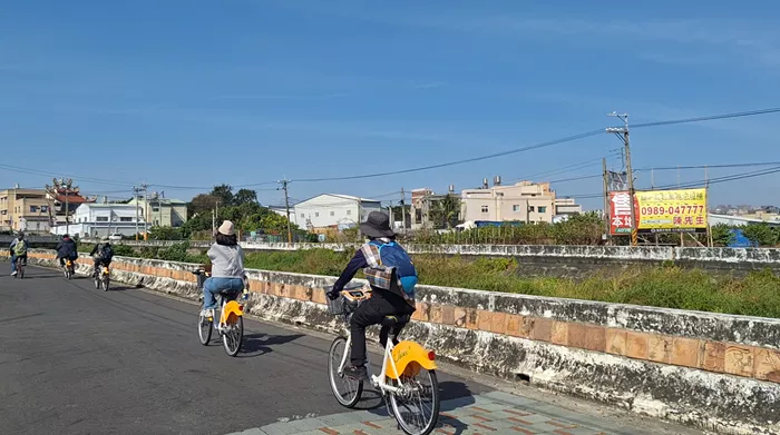 學員們騎著腳踏車輕旅行,跟著陳子鎮老師一路探索筏子溪中段兩側步道,