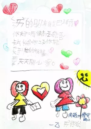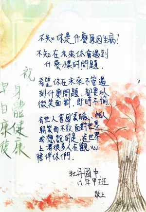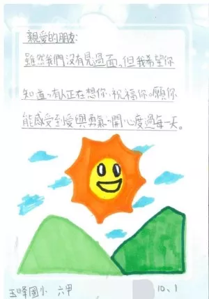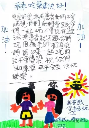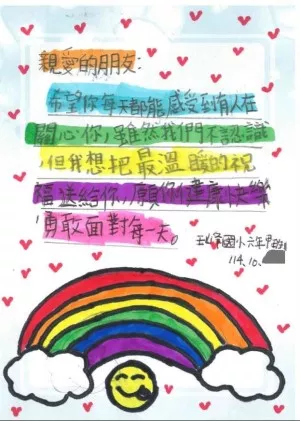 今年在進行疾病管制署、新北市社會局補助的偏鄉校園宣導時,每位學生會拿到一張祝福卡,參與後可以在背面寫上文字、加上圖畫以表達關懷。校方提供學生作品電子檔,經過評選,有幾位獲獎名額,大家可欣賞這些作品,感受他們充滿支持的情意。(恭喜獲選的:新竹縣玉峰國小、屏東縣牡丹國中、屏東縣地磨兒國小德文分校學生)