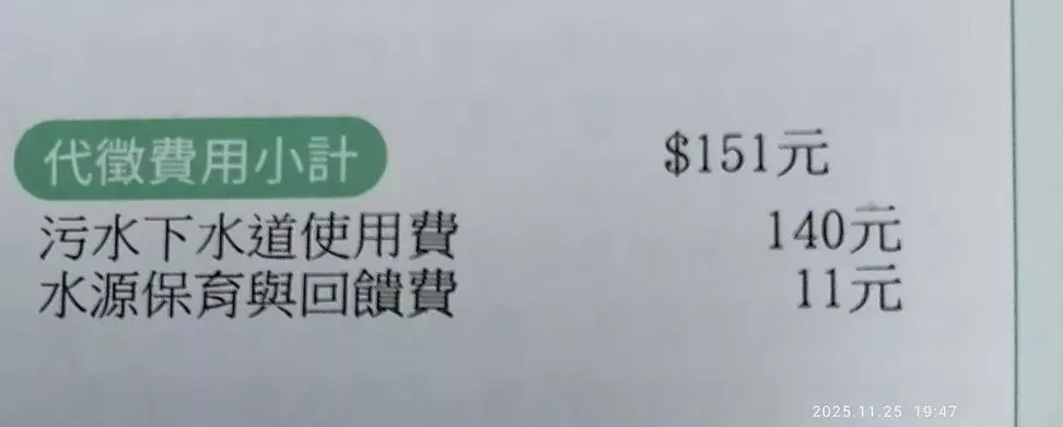 除了水費外,收費項目尚有受委代收的「污水下水道使用費(縣(市)主管機關)」和「水源保育與回饋費(經濟部水利署)」
